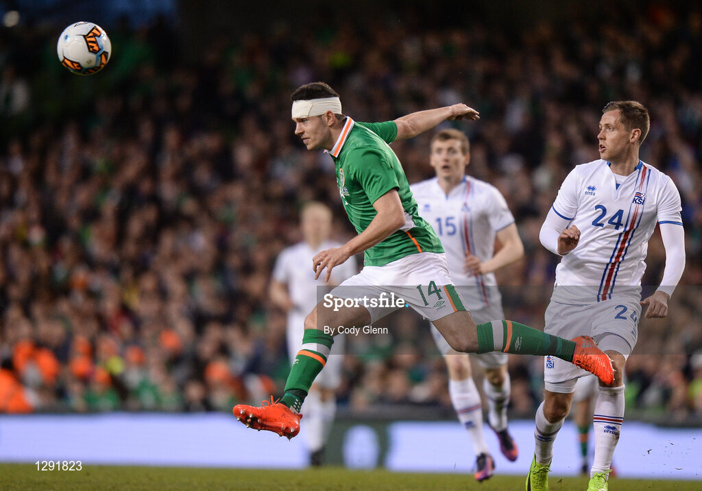28 March 2017; John Egan of Republic of Ireland in action against Kjartan Henry Finnbogason of Iceland during the International Friendly match between the Republic of Ireland and Iceland at the Aviva Stadium in Dublin. Photo by Cody Glenn/Sportsfile