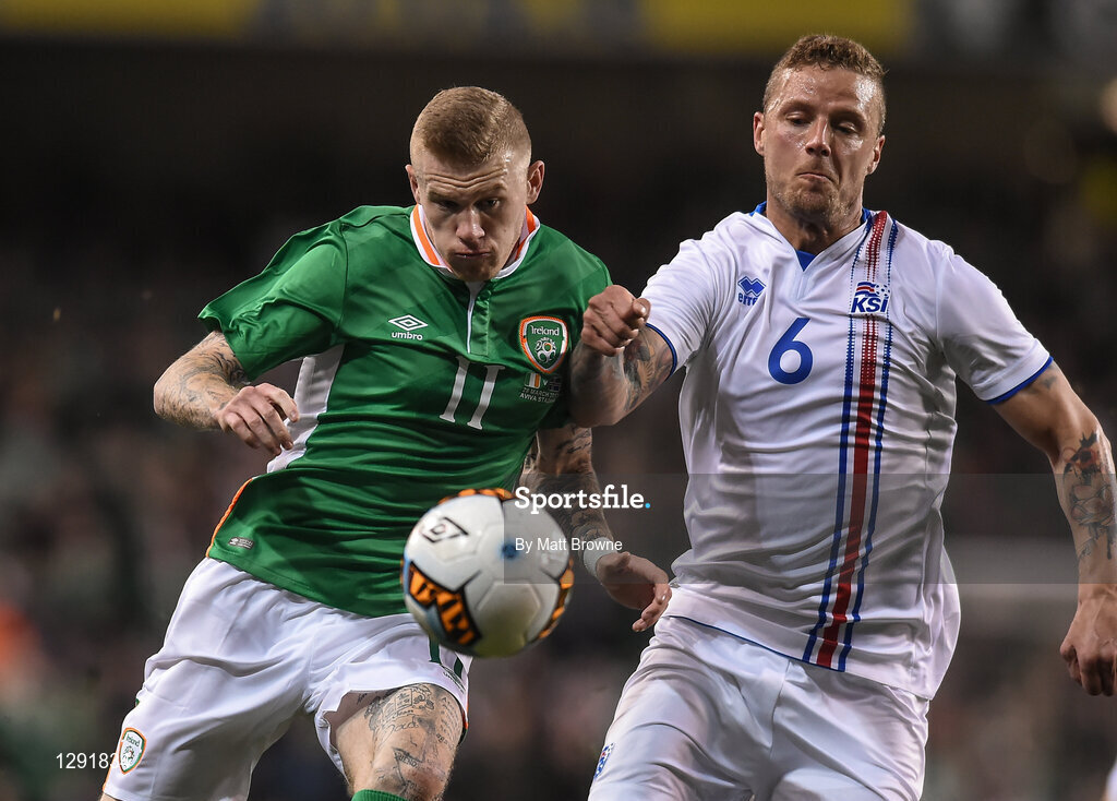 28 March 2017; James McClean of Republic of Ireland in action against Ragnar Sigurdsson of Iceland during the International Friendly match between the Republic of Ireland and Iceland at the Aviva Stadium in Dublin. Photo by Matt Browne/Sportsfile