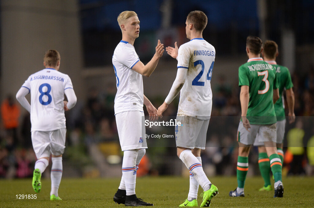 28 March 2017; Hordur Bjorgvin Magnusson, left, of Iceland is congratulated by his team-mate Kjartan Henry Finnbogason after scoring his side's first goal during the International Friendly match between the Republic of Ireland and Iceland at the Aviva Stadium in Dublin. Photo by Cody Glenn/Sportsfile