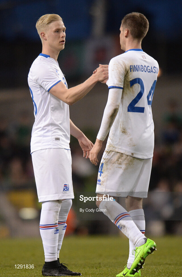 28 March 2017; Hordur Bjorgvin Magnusson, left, of Iceland is congratulated by his team-mate Kjartan Henry Finnbogason after scoring his side's first goal during the International Friendly match between the Republic of Ireland and Iceland at the Aviva Stadium in Dublin. Photo by Cody Glenn/Sportsfile