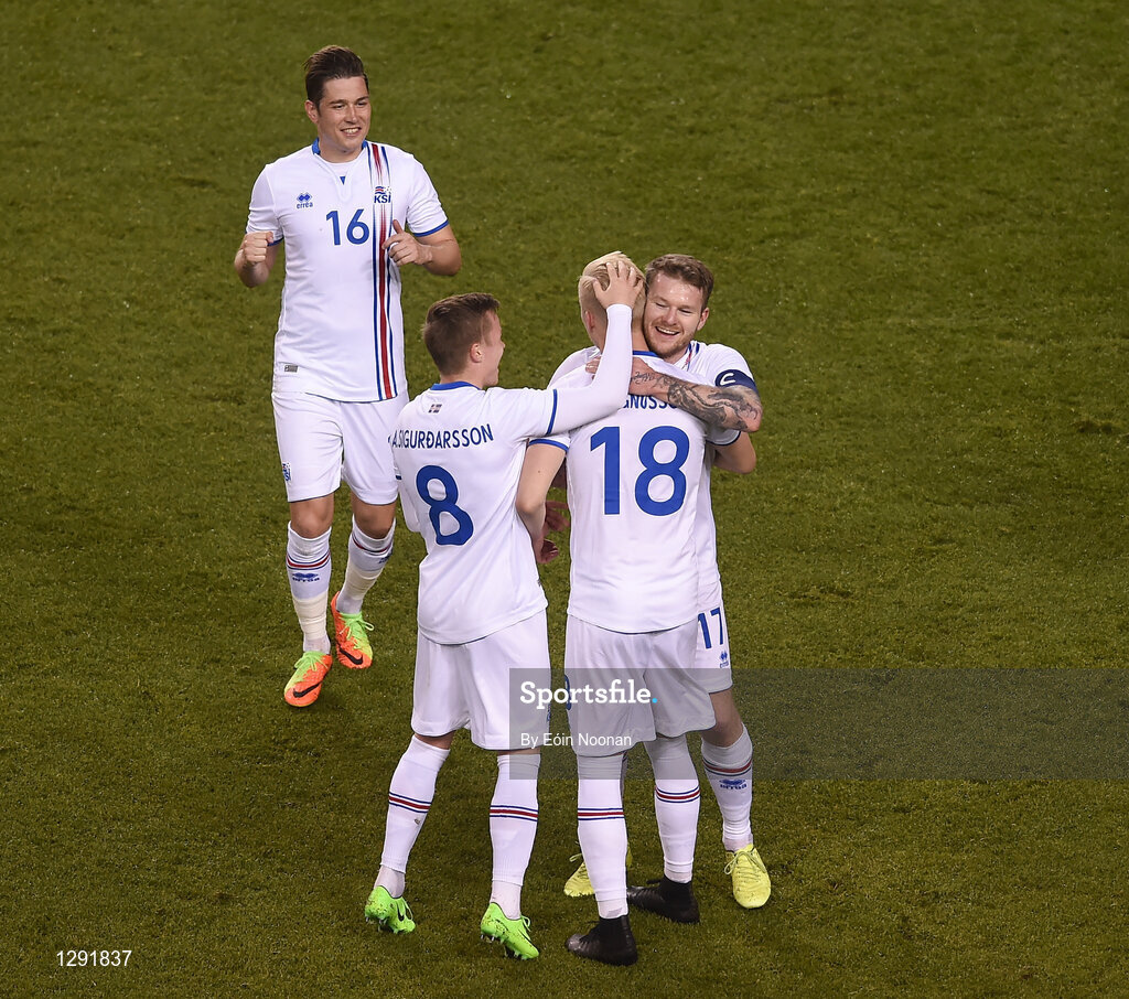 28 March 2017; Hordur Bjorgvin Magnusson, 18, of Iceland is congratulated by his team-mates after scoring his side's first goal during the International Friendly match between the Republic of Ireland and Iceland at the Aviva Stadium in Dublin. Photo by Eóin Noonan/Sportsfile