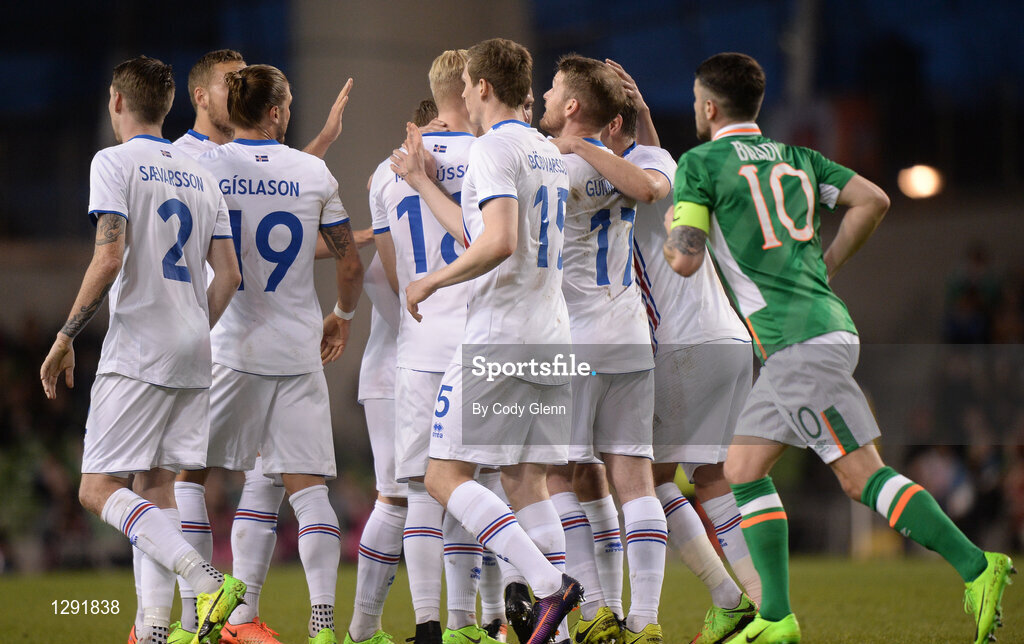 28 March 2017; Hordur Bjorgvin Magnusson, centre, of Iceland is congratulated by his team-mates after scoring his side's first goal during the International Friendly match between the Republic of Ireland and Iceland at the Aviva Stadium in Dublin. Photo by Cody Glenn/Sportsfile