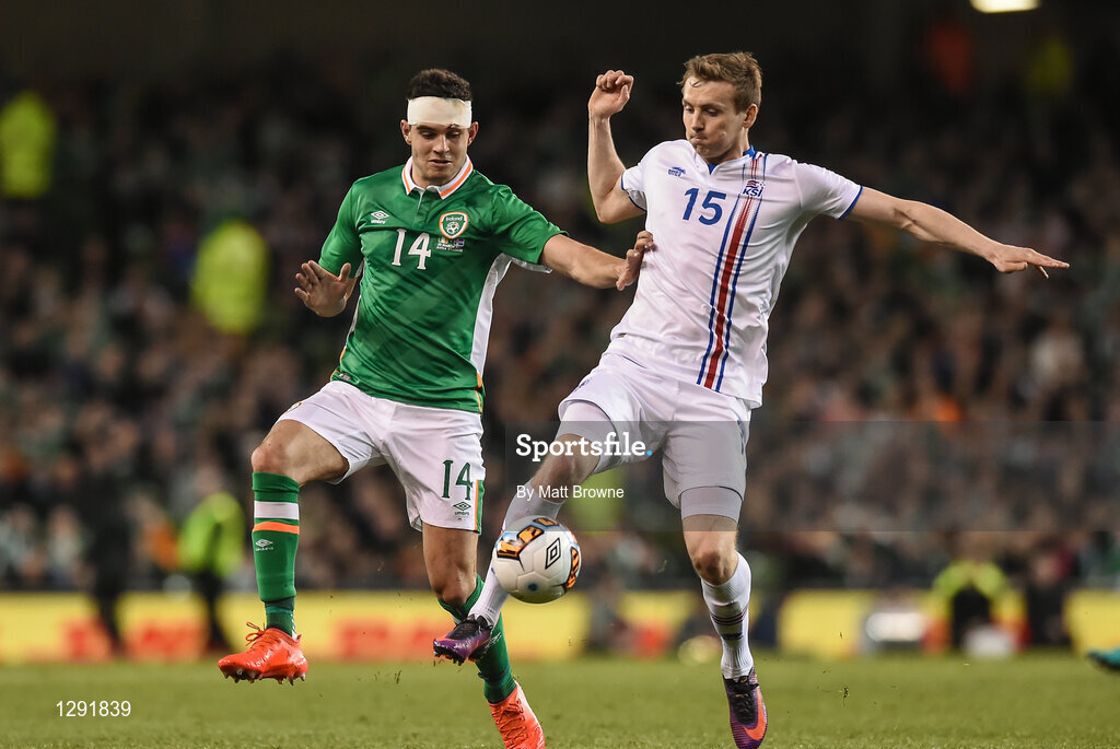 28 March 2017; Kari Arnason of Iceland in action against John Egan of Republic of Ireland during the International Friendly match between the Republic of Ireland and Iceland at the Aviva Stadium in Dublin. Photo by Matt Browne/Sportsfile