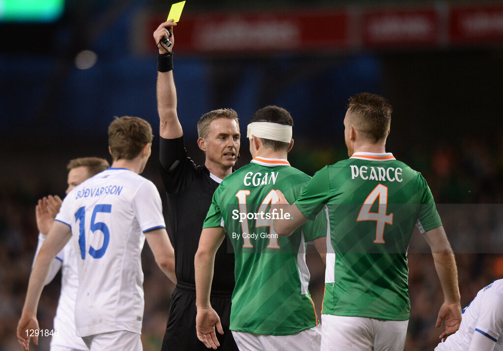 28 March 2017; John Egan of Republic of Ireland is shown a yellow card by referee Jakob kehlet during the International Friendly match between the Republic of Ireland and Iceland at the Aviva Stadium in Dublin. Photo by Cody Glenn/Sportsfile