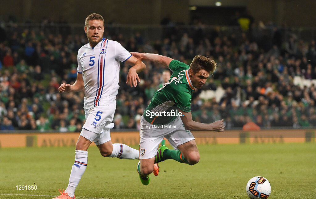 28 March 2017; Kevin Doyle of Republic of Ireland in action against Sverrir Ingi Ingason of Iceland during the International Friendly match between the Republic of Ireland and Iceland at the Aviva Stadium in Dublin. Photo by David Maher/Sportsfile