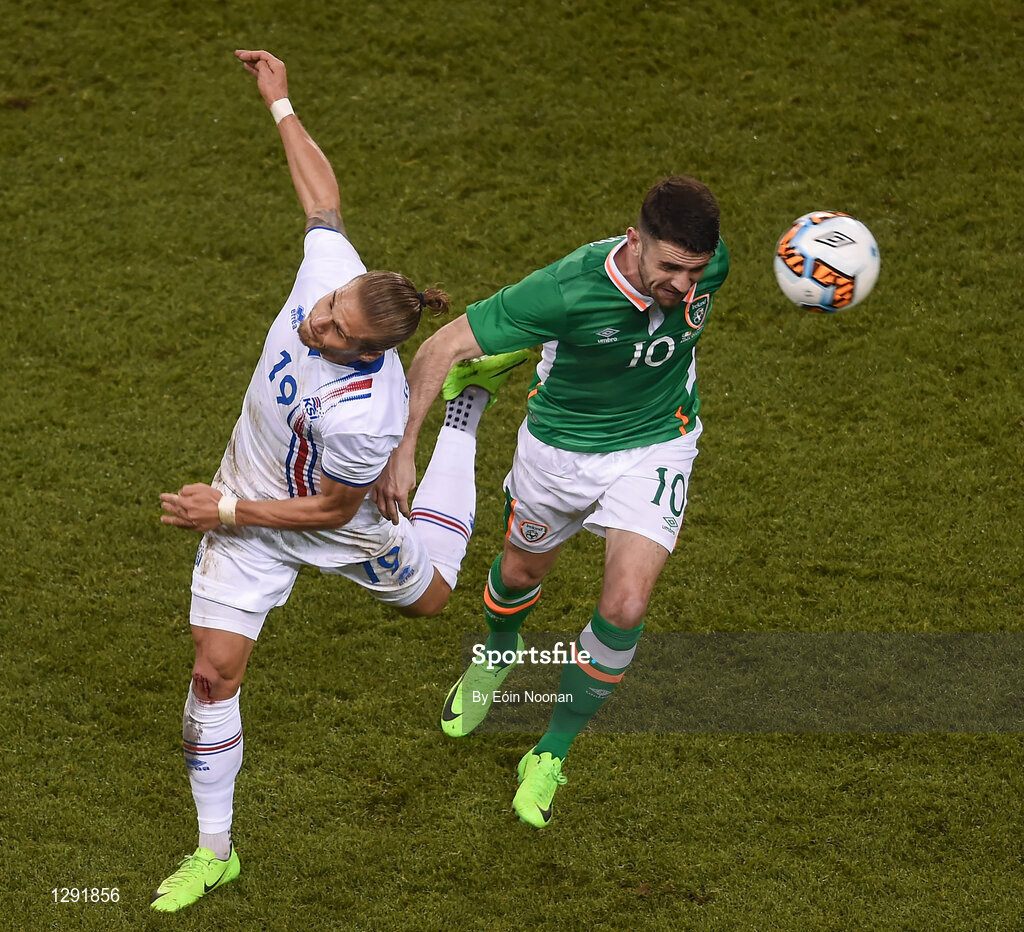 28 March 2017; Robbie Brady of Republic of Ireland in action against Rurik Gislason of Iceland during the International Friendly match between the Republic of Ireland and Iceland at the Aviva Stadium in Dublin. Photo by Eóin Noonan/Sportsfile
