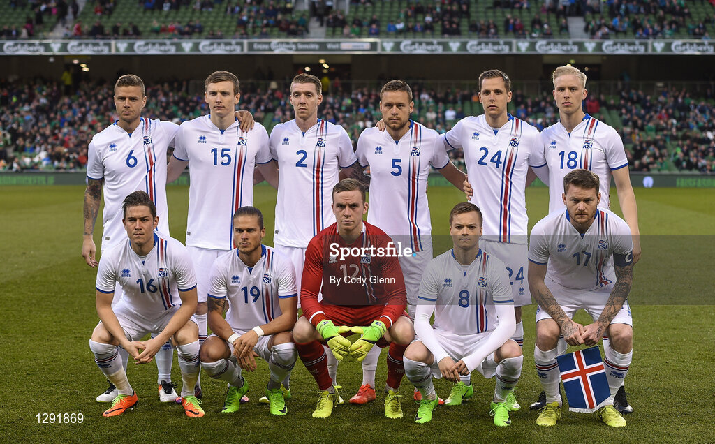 28 March 2017; The Iceland team, back row, from left to right, Ragnar Sigurdsson, Jon Dadi Bodvarsson, Birkier Mar, Sverrir Ingi Ingason, Kjartan Henry Finnbogason and Hordur Bjorgvin Magnusson. Front row, from left to right, Olafur Ingi Skulsaon, Rurik Gislason, Ogmudur Kristinsson, Aron Sigurdsson and Aron Einar Gunnarsson prior to the International Friendly match between the Republic of Ireland and Iceland at the Aviva Stadium in Dublin. Photo by Cody Glenn/Sportsfile