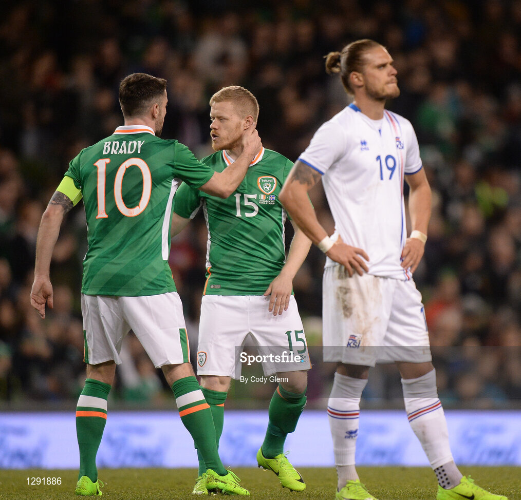 28 March 2017; Daryl Horgan, centre, of Republic of Ireland with team-mate Robbie Brady after coming on as a second half substitute during the International Friendly match between the Republic of Ireland and Iceland at the Aviva Stadium in Dublin. Photo by Cody Glenn/Sportsfile