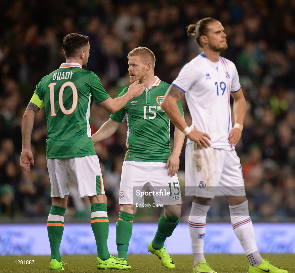 28 March 2017; Daryl Horgan, centre, of Republic of Ireland with team-mate Robbie Brady after coming on as a second half substitute during the International Friendly match between the Republic of Ireland and Iceland at the Aviva Stadium in Dublin. Photo by Cody Glenn/Sportsfile