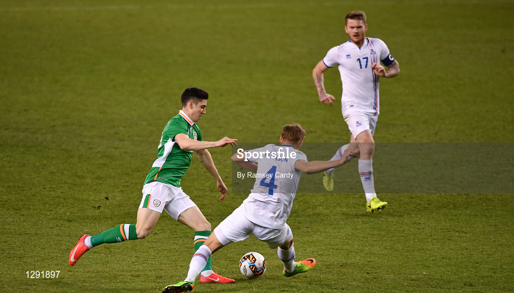 28 March 2017; Callum O'Dowda of Republic of Ireland in action against Holmar Eyjolfsson of Iceland during the International Friendly match between the Republic of Ireland and Iceland at the Aviva Stadium in Dublin. Photo by Ramsey Cardy/Sportsfile