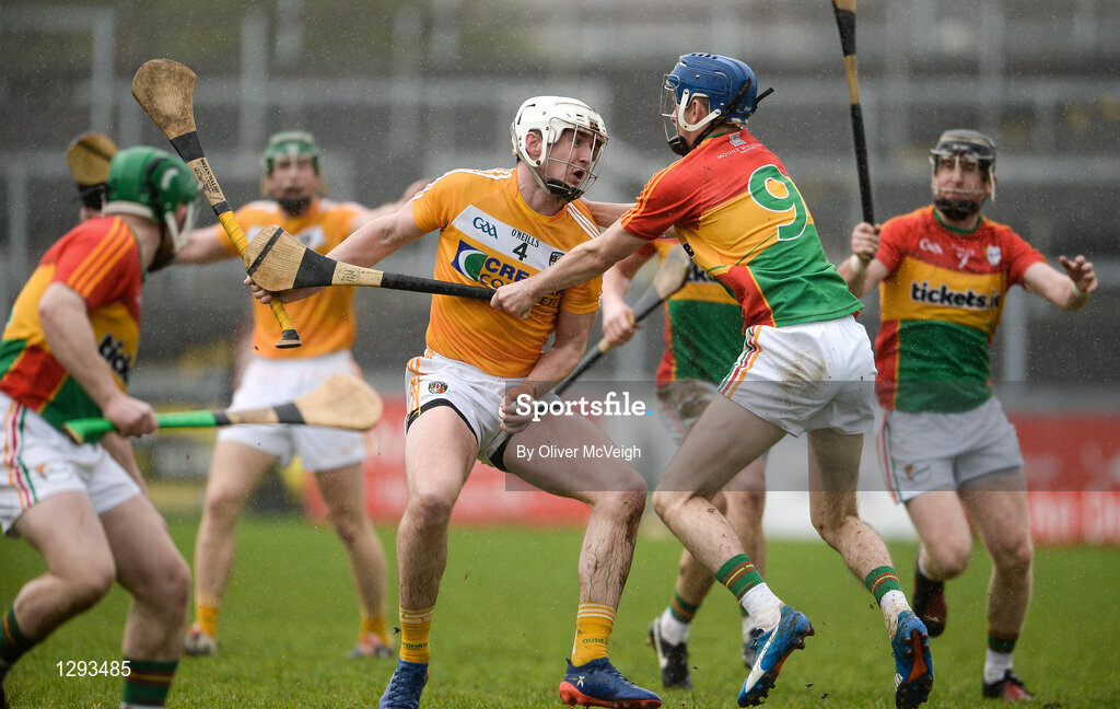 1 April 2017; Conor McKinley of Antrim in action against Sean Whelan of Carlow during the Allianz Hurling League Division 2A Final match between Antrim and Carlow at Páirc Esler, in Newry. Photo by Oliver McVeigh/Sportsfile