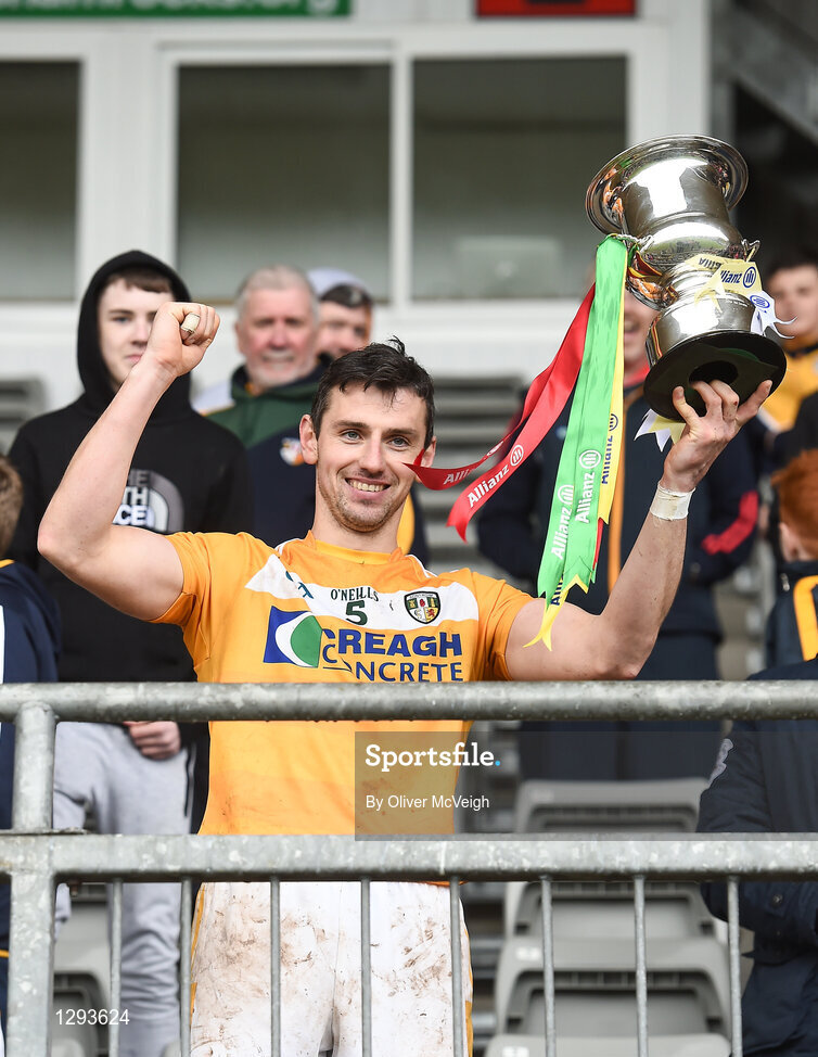 1 April 2017; Simon McCrory of Antrim lifts the cup after the Allianz Hurling League Division 2A Final match between Antrim and Carlow at Páirc Esler, in Newry. Photo by Oliver McVeigh/Sportsfile
