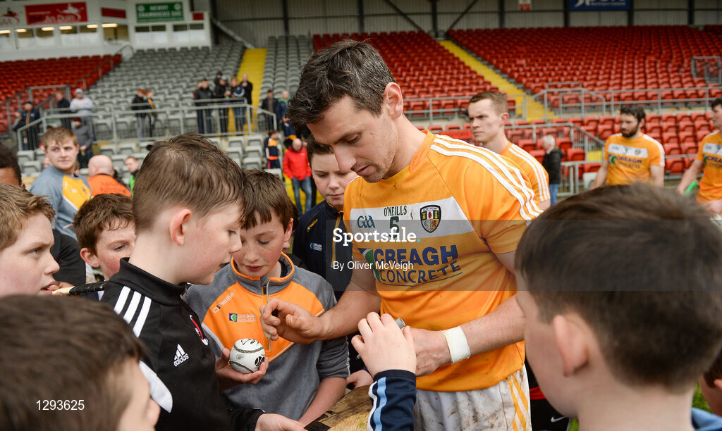1 April 2017; Simon McCrory of Antrim signs autographs for young supporters after the Allianz Hurling League Division 2A Final match between Antrim and Carlow at Páirc Esler, in Newry. Photo by Oliver McVeigh/Sportsfile