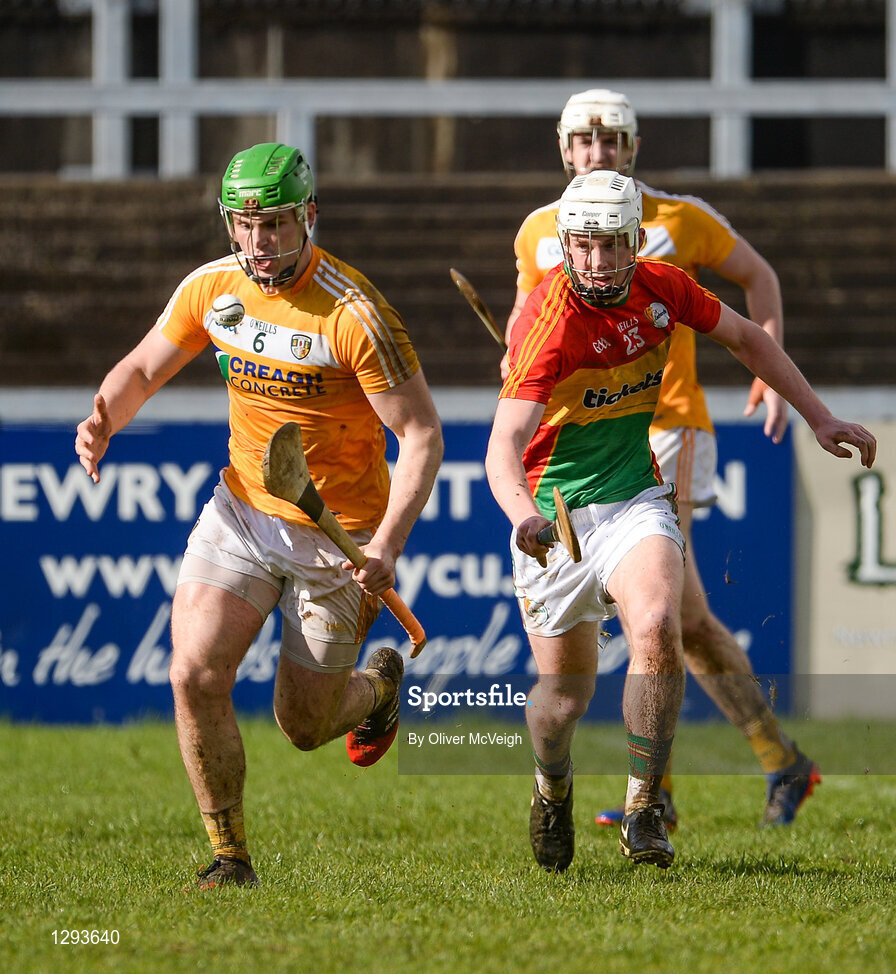 1 April 2017; Matthew Donnelly of Antrim in action against Kevin McDonald of Carlow during the Allianz Hurling League Division 2A Final match between Antrim and Carlow at Páirc Esler in Newry. Photo by Oliver McVeigh/Sportsfile