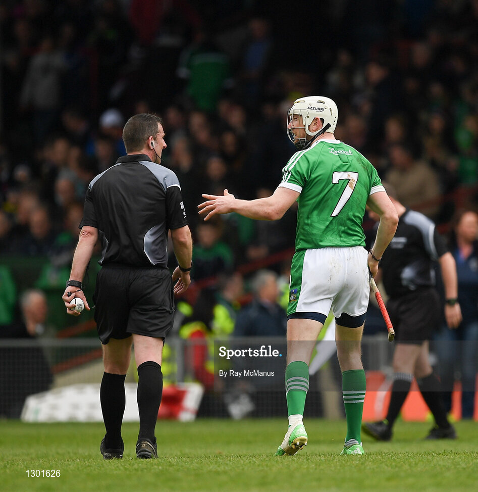 16 April 2017; Seamus Hickey of Limerick talking to referee Paul O'Dwyer at half time during the Allianz Hurling League Division 1 Semi-Final match between Limerick and Galway at the Gaelic Grounds in Limerick. Photo by Ray McManus/Sportsfile