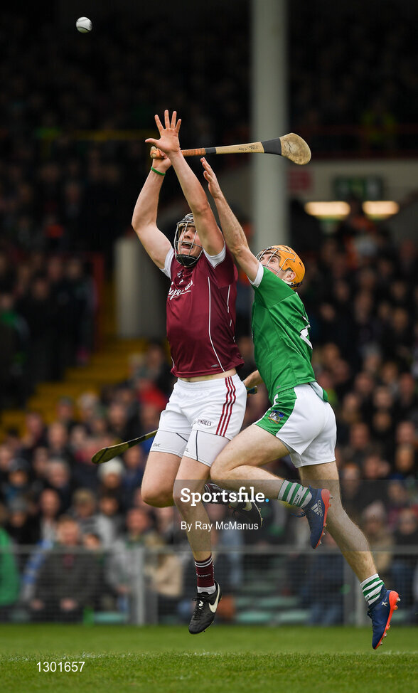 16 April 2017; Joseph Cooney of Galway in action against Richie English of Limerick during the Allianz Hurling League Division 1 Semi-Final match between Limerick and Galway at the Gaelic Grounds in Limerick. Photo by Ray McManus/Sportsfile