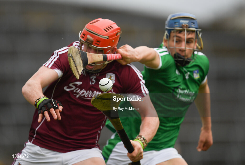 16 April 2017; The sliothar is the centre of focus as Conor Whelan of Galway is tackled by Mike Casey of Limerick during the Allianz Hurling League Division 1 Semi-Final match between Limerick and Galway at the Gaelic Grounds in Limerick. Photo by Ray McManus/Sportsfile