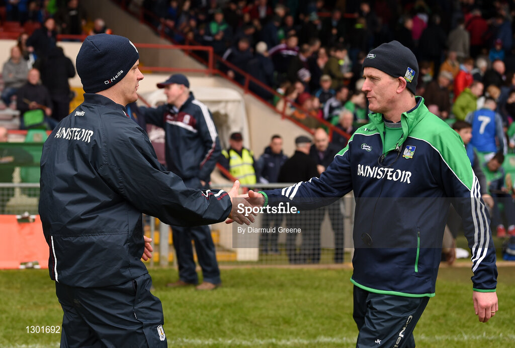 16 April 2017; Galway manager Michéal Donoghue and Limerick manager John Kiely exchange a handshake after the Allianz Hurling League Division 1 Semi-Final match between Limerick and Galway at the Gaelic Grounds in Limerick. Photo by Diarmuid Greene/Sportsfile