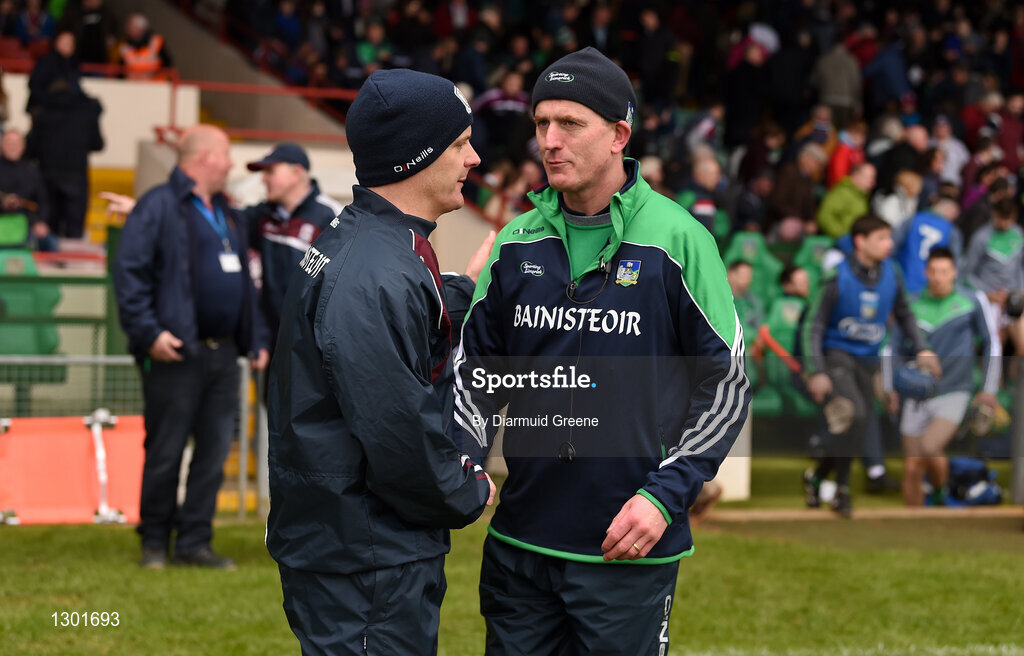 16 April 2017; Galway manager Michéal Donoghue and Limerick manager John Kiely exchange a handshake after the Allianz Hurling League Division 1 Semi-Final match between Limerick and Galway at the Gaelic Grounds in Limerick. Photo by Diarmuid Greene/Sportsfile