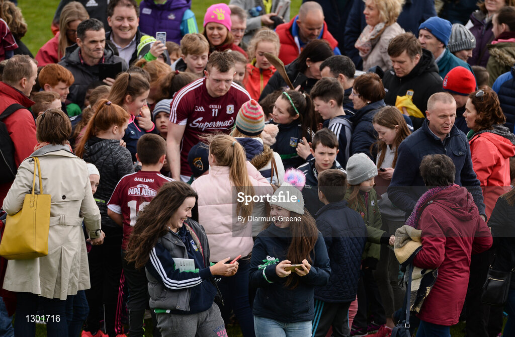 16 April 2017; Aisling Magner, from Ashford, left, and Niamh Mullins, from Ardagh, Co. Limerick react after each taking a selfie with Joe Canning of Galway after the Allianz Hurling League Division 1 Semi-Final match between Limerick and Galway at the Gaelic Grounds in Limerick. Photo by Diarmuid Greene/Sportsfile