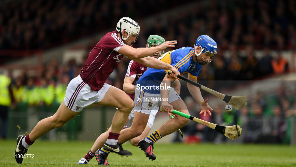 23 April 2017; John McGrath of Tipperary in action against Adrian Ó Tuathaig and Daithí de Búrca of Galway during the Allianz Hurling League Division 1 Final match between Galway and Tipperary at Gaelic Grounds, in Limerick. Photo by Ray McManus/Sportsfile