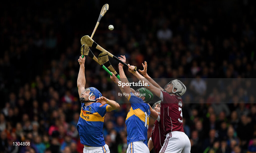 23 April 2017; Daithí de Búrca, 3, and Adrian Ó Tuathaig of Galway in action against John McGrath, left, and Noel McGrath of Tipperary during the Allianz Hurling League Division 1 Final match between Galway and Tipperary at Gaelic Grounds, in Limerick. Photo by Ray McManus/Sportsfile