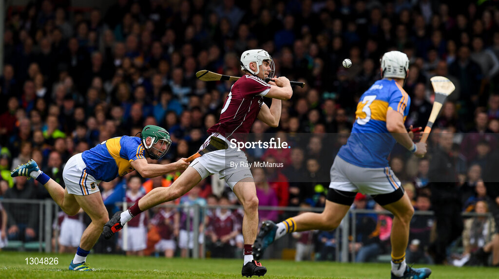 23 April 2017; Jason Flynn of Galway shoots past James Barry, 3 , and Cathal Barrett of Tipperary to score a goal early in second half during the Allianz Hurling League Division 1 Final match between Galway and Tipperary at Gaelic Grounds, in Limerick. Photo by Ray McManus/Sportsfile
