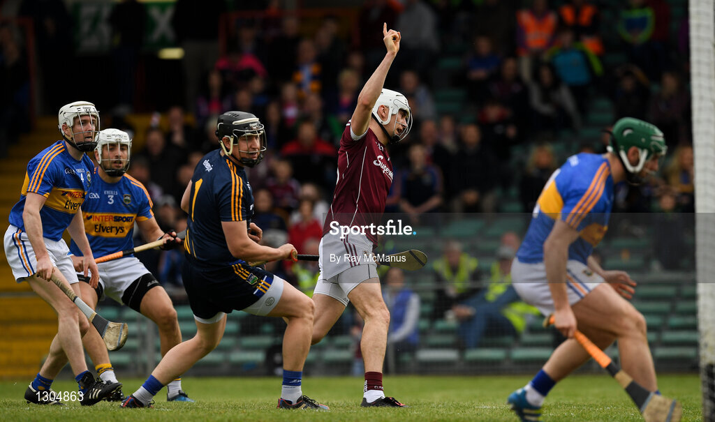 23 April 2017; Jason Flynn , centre, celebrates after scoring Galway's second goal during the Allianz Hurling League Division 1 Final match between Galway and Tipperary at Gaelic Grounds, in Limerick. Photo by Ray McManus/Sportsfile