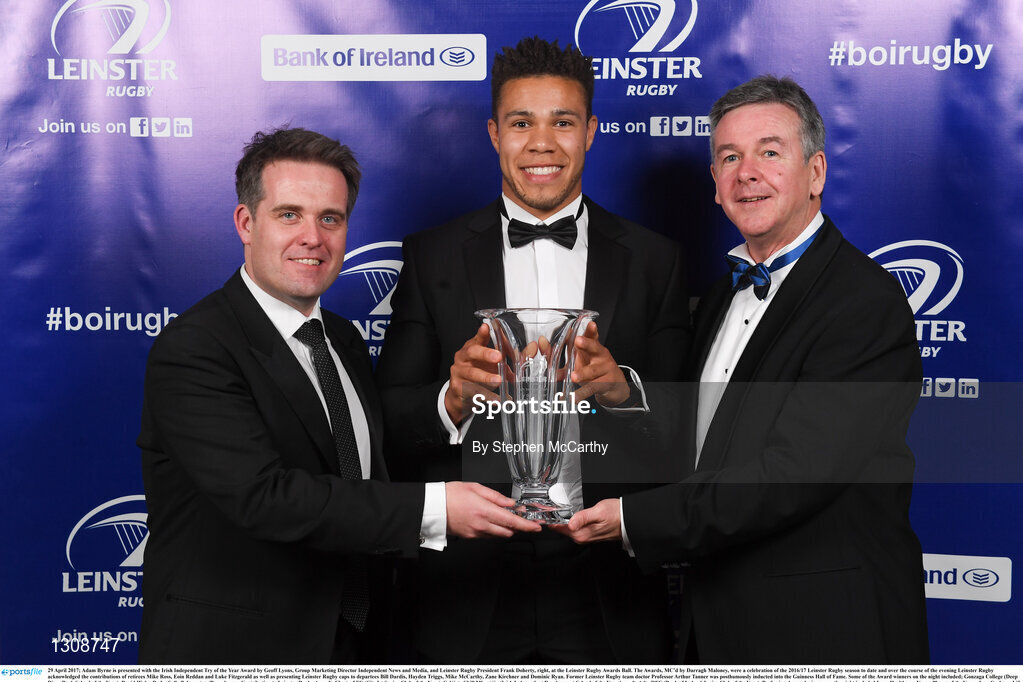 29 April 2017; Adam Byrne is presented with the Irish Independent Try of the Year Award by Geoff Lyons, Group Marketing Director Independent News and Media, and Leinster Rugby President Frank Doherty, right, at the Leinster Rugby Awards Ball. The Awards, MC’d by Darragh Maloney, were a celebration of the 2016/17 Leinster Rugby season to date and over the course of the evening Leinster Rugby acknowledged the contributions of retirees Mike Ross, Eóin Reddan and Luke Fitzgerald as well as presenting Leinster Rugby caps to departees Bill Dardis, Hayden Triggs, Mike McCarthy, Zane Kirchner and Dominic Ryan. Former Leinster Rugby team doctor Professor Arthur Tanner was posthumously inducted into the Guinness Hall of Fame. Some of the Award winners on the night included; Gonzaga College (Deep River Rock School of the Year), David Hicks, De La Salle Palmerston (Beauchamps Contribution to Leinster Rugby Award), Clontarf FC (CityJet Senior Club of the Year), Coláiste Chill Mhantáin (Irish Independent Development School of the Year Award), Athy RFC (Bank of Ireland Junior Club of the Year). Professional award winners on the night included Laya Healthcare Young Player of the Year - Joey Carbery, Life Style Sports Supporters Player of the Year - Isa Nacewa, Canterbury Tackle of the Year – Isa Nacewa, Irish Independnet Try of the Year – Adam Byrne and Bank of Ireland Players’ Player of the Year – Luke McGrath. Clayton Hotel, Burlington Road, Dublin 4. Photo by Stephen McCarthy/Sportsfile