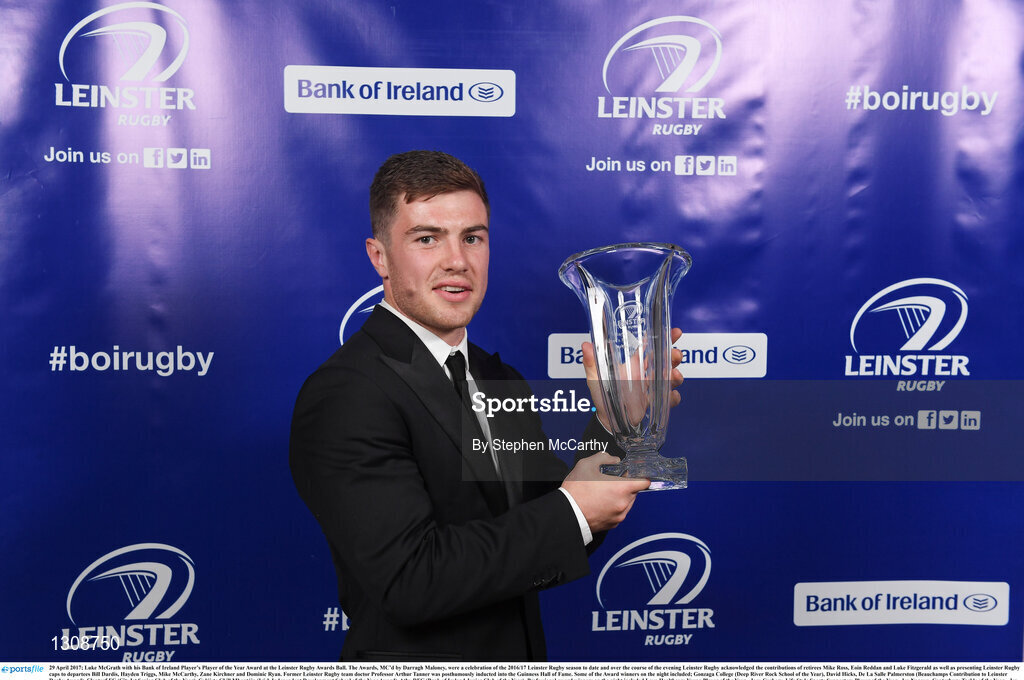 29 April 2017; Luke McGrath with his Bank of Ireland Player’s Player of the Year Award at the Leinster Rugby Awards Ball. The Awards, MC’d by Darragh Maloney, were a celebration of the 2016/17 Leinster Rugby season to date and over the course of the evening Leinster Rugby acknowledged the contributions of retirees Mike Ross, Eóin Reddan and Luke Fitzgerald as well as presenting Leinster Rugby caps to departees Bill Dardis, Hayden Triggs, Mike McCarthy, Zane Kirchner and Dominic Ryan. Former Leinster Rugby team doctor Professor Arthur Tanner was posthumously inducted into the Guinness Hall of Fame. Some of the Award winners on the night included; Gonzaga College (Deep River Rock School of the Year), David Hicks, De La Salle Palmerston (Beauchamps Contribution to Leinster Rugby Award), Clontarf FC (CityJet Senior Club of the Year), Coláiste Chill Mhantáin (Irish Independent Development School of the Year Award), Athy RFC (Bank of Ireland Junior Club of the Year). Professional award winners on the night included Laya Healthcare Young Player of the Year - Joey Carbery, Life Style Sports Supporters Player of the Year - Isa Nacewa, Canterbury Tackle of the Year – Isa Nacewa, Irish Independnet Try of the Year – Adam Byrne and Bank of Ireland Players’ Player of the Year – Luke McGrath. Clayton Hotel, Burlington Road, Dublin 4. Photo by Stephen McCarthy/Sportsfile