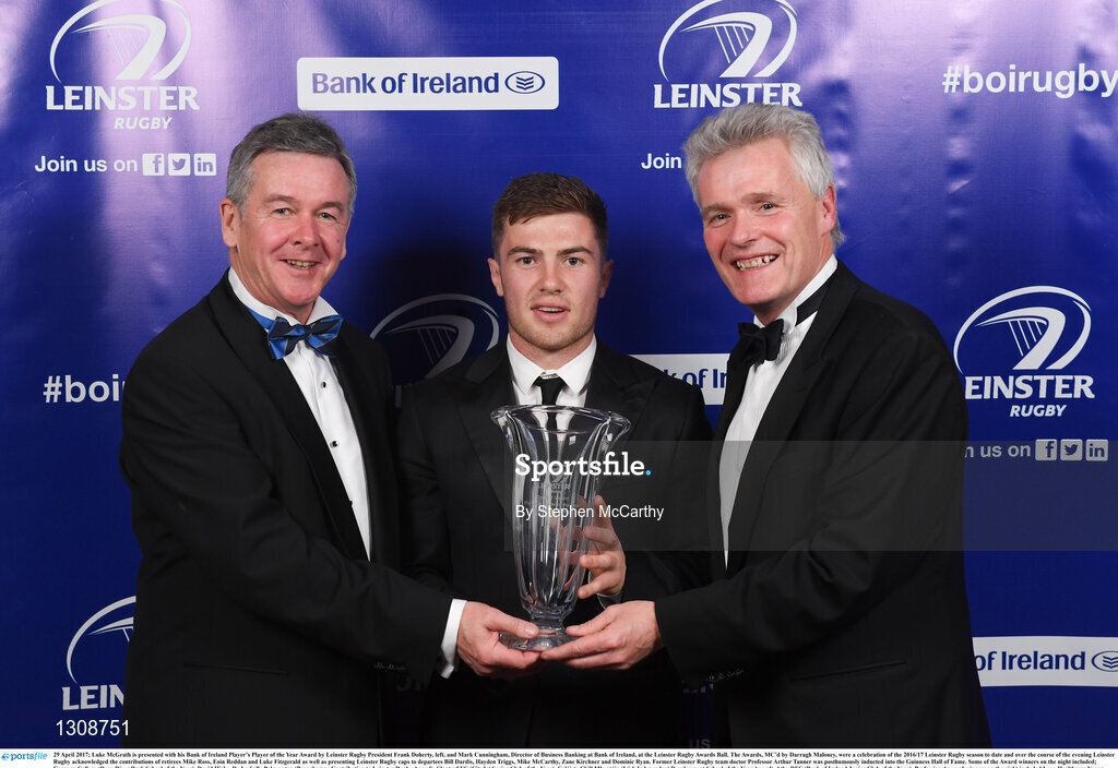29 April 2017; Luke McGrath is presented with his Bank of Ireland Player’s Player of the Year Award by Leinster Rugby President Frank Doherty, left, and Mark Cunningham, Director of Business Banking at Bank of Ireland, at the Leinster Rugby Awards Ball. The Awards, MC’d by Darragh Maloney, were a celebration of the 2016/17 Leinster Rugby season to date and over the course of the evening Leinster Rugby acknowledged the contributions of retirees Mike Ross, Eóin Reddan and Luke Fitzgerald as well as presenting Leinster Rugby caps to departees Bill Dardis, Hayden Triggs, Mike McCarthy, Zane Kirchner and Dominic Ryan. Former Leinster Rugby team doctor Professor Arthur Tanner was posthumously inducted into the Guinness Hall of Fame. Some of the Award winners on the night included; Gonzaga College (Deep River Rock School of the Year), David Hicks, De La Salle Palmerston (Beauchamps Contribution to Leinster Rugby Award), Clontarf FC (CityJet Senior Club of the Year), Coláiste Chill Mhantáin (Irish Independent Development School of the Year Award), Athy RFC (Bank of Ireland Junior Club of the Year). Professional award winners on the night included Laya Healthcare Young Player of the Year - Joey Carbery, Life Style Sports Supporters Player of the Year - Isa Nacewa, Canterbury Tackle of the Year – Isa Nacewa, Irish Independnet Try of the Year – Adam Byrne and Bank of Ireland Players’ Player of the Year – Luke McGrath. Clayton Hotel, Burlington Road, Dublin 4. Photo by Stephen McCarthy/Sportsfile