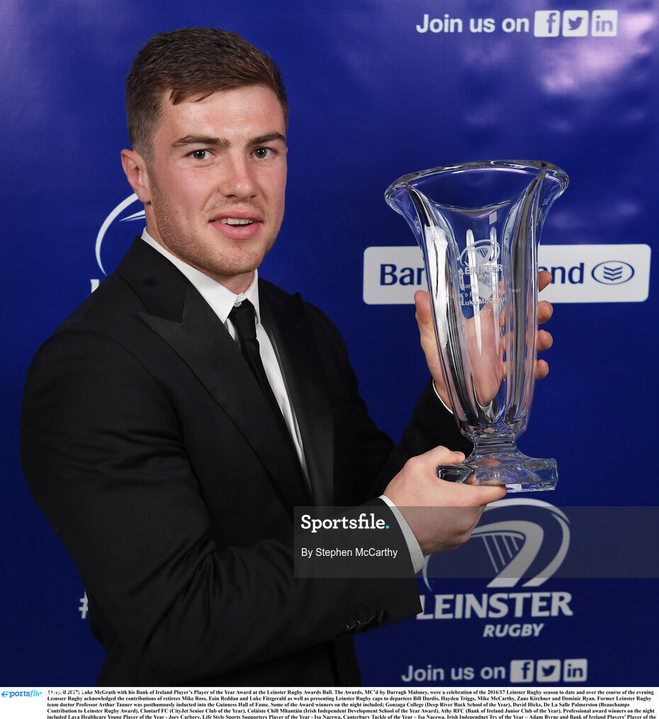 29 April 2017; Luke McGrath with his Bank of Ireland Player’s Player of the Year Award at the Leinster Rugby Awards Ball. The Awards, MC’d by Darragh Maloney, were a celebration of the 2016/17 Leinster Rugby season to date and over the course of the evening Leinster Rugby acknowledged the contributions of retirees Mike Ross, Eóin Reddan and Luke Fitzgerald as well as presenting Leinster Rugby caps to departees Bill Dardis, Hayden Triggs, Mike McCarthy, Zane Kirchner and Dominic Ryan. Former Leinster Rugby team doctor Professor Arthur Tanner was posthumously inducted into the Guinness Hall of Fame. Some of the Award winners on the night included; Gonzaga College (Deep River Rock School of the Year), David Hicks, De La Salle Palmerston (Beauchamps Contribution to Leinster Rugby Award), Clontarf FC (CityJet Senior Club of the Year), Coláiste Chill Mhantáin (Irish Independent Development School of the Year Award), Athy RFC (Bank of Ireland Junior Club of the Year). Professional award winners on the night included Laya Healthcare Young Player of the Year - Joey Carbery, Life Style Sports Supporters Player of the Year - Isa Nacewa, Canterbury Tackle of the Year – Isa Nacewa, Irish Independnet Try of the Year – Adam Byrne and Bank of Ireland Players’ Player of the Year – Luke McGrath. Clayton Hotel, Burlington Road, Dublin 4. Photo by Stephen McCarthy/Sportsfile