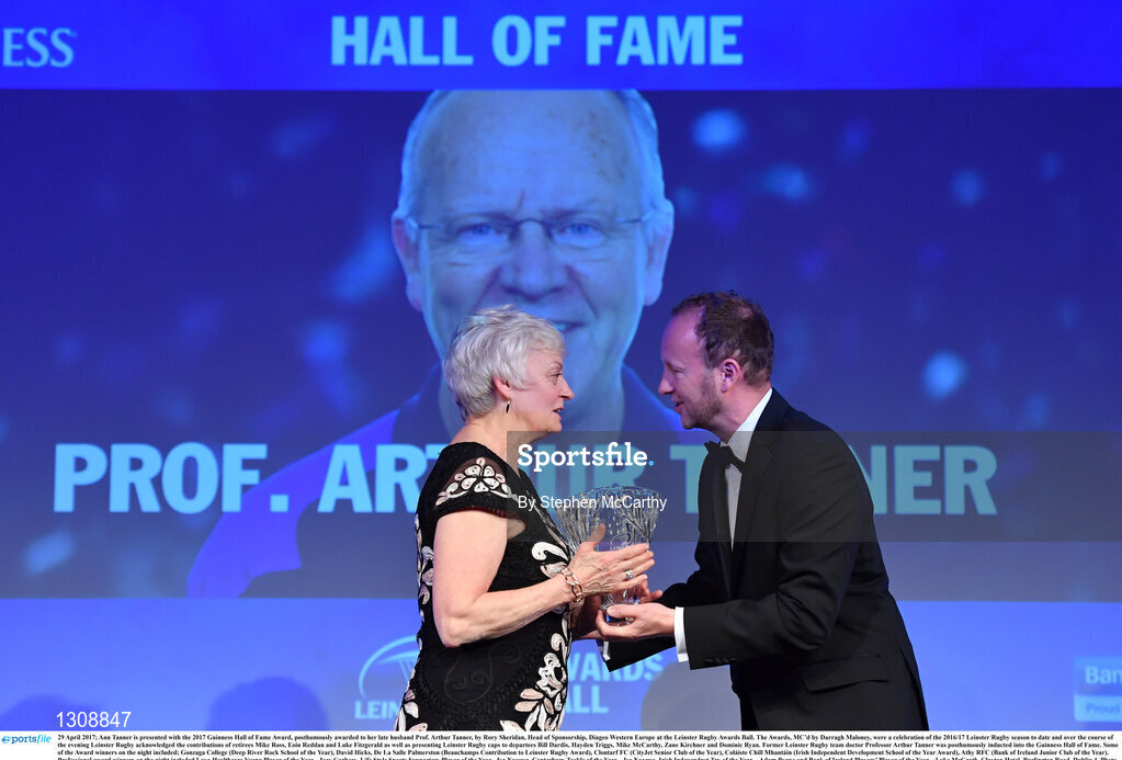 29 April 2017; Ann Tanner is presented with the 2017 Guinness Hall of Fame Award, posthumously awarded to her late husband Prof. Arthur Tanner, by Rory Sheridan, Head of Sponsorship, Diageo Western Europe at the Leinster Rugby Awards Ball. The Awards, MC’d by Darragh Maloney, were a celebration of the 2016/17 Leinster Rugby season to date and over the course of the evening Leinster Rugby acknowledged the contributions of retirees Mike Ross, Eóin Reddan and Luke Fitzgerald as well as presenting Leinster Rugby caps to departees Bill Dardis, Hayden Triggs, Mike McCarthy, Zane Kirchner and Dominic Ryan. Former Leinster Rugby team doctor Professor Arthur Tanner was posthumously inducted into the Guinness Hall of Fame. Some of the Award winners on the night included; Gonzaga College (Deep River Rock School of the Year), David Hicks, De La Salle Palmerston (Beauchamps Contribution to Leinster Rugby Award), Clontarf FC (CityJet Senior Club of the Year), Coláiste Chill Mhantáin (Irish Independent Development School of the Year Award), Athy RFC (Bank of Ireland Junior Club of the Year). Professional award winners on the night included Laya Healthcare Young Player of the Year - Joey Carbery, Life Style Sports Supporters Player of the Year - Isa Nacewa, Canterbury Tackle of the Year – Isa Nacewa, Irish Independnet Try of the Year – Adam Byrne and Bank of Ireland Players’ Player of the Year – Luke McGrath. Clayton Hotel, Burlington Road, Dublin 4. Photo by Stephen McCarthy/Sportsfile