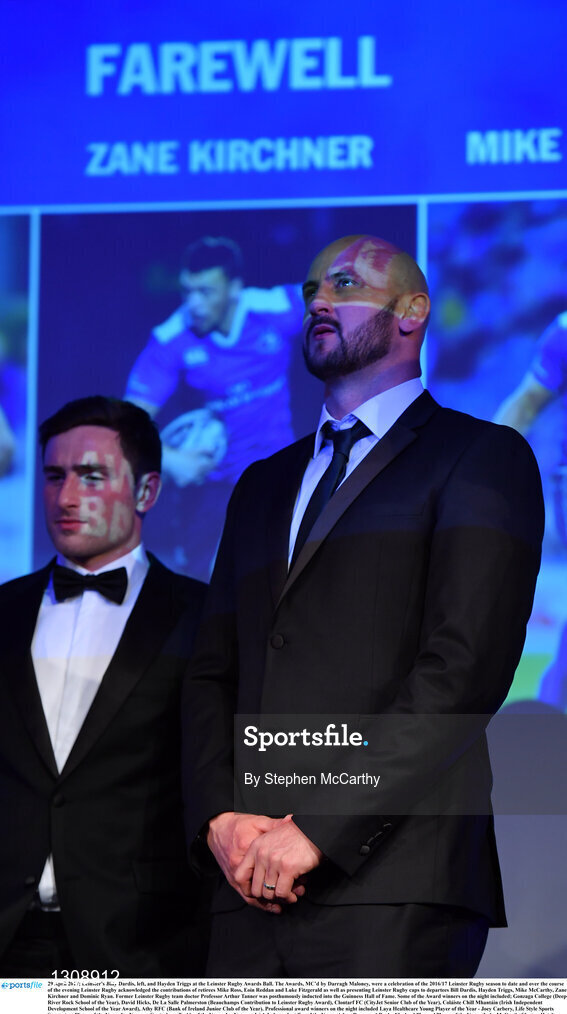 29 April 2017; Leinster's Billy Dardis, left, and Hayden Triggs at the Leinster Rugby Awards Ball. The Awards, MC’d by Darragh Maloney, were a celebration of the 2016/17 Leinster Rugby season to date and over the course of the evening Leinster Rugby acknowledged the contributions of retirees Mike Ross, Eóin Reddan and Luke Fitzgerald as well as presenting Leinster Rugby caps to departees Bill Dardis, Hayden Triggs, Mike McCarthy, Zane Kirchner and Dominic Ryan. Former Leinster Rugby team doctor Professor Arthur Tanner was posthumously inducted into the Guinness Hall of Fame. Some of the Award winners on the night included; Gonzaga College (Deep River Rock School of the Year), David Hicks, De La Salle Palmerston (Beauchamps Contribution to Leinster Rugby Award), Clontarf FC (CityJet Senior Club of the Year), Coláiste Chill Mhantáin (Irish Independent Development School of the Year Award), Athy RFC (Bank of Ireland Junior Club of the Year). Professional award winners on the night included Laya Healthcare Young Player of the Year - Joey Carbery, Life Style Sports Supporters Player of the Year - Isa Nacewa, Canterbury Tackle of the Year – Isa Nacewa, Irish Independnet Try of the Year – Adam Byrne and Bank of Ireland Players’ Player of the Year – Luke McGrath. Clayton Hotel, Burlington Road, Dublin 4. Photo by Stephen McCarthy/Sportsfile