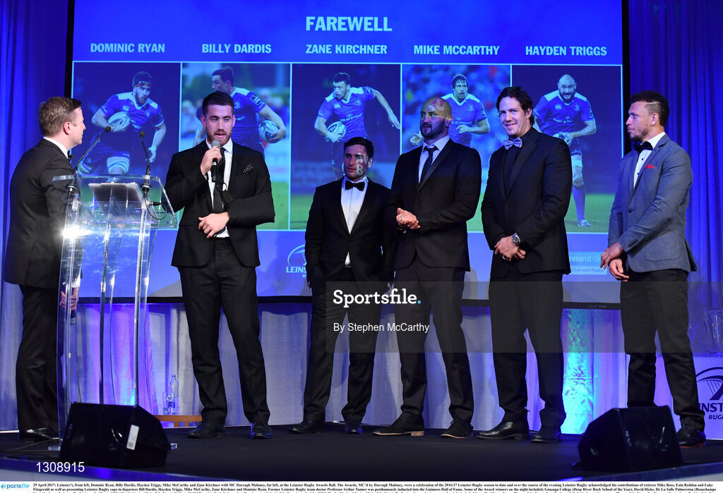 29 April 2017; Leinster's, from left, Dominic Ryan, Billy Dardis, Hayden Triggs, Mike McCarthy and Zane Kirchner with MC Darragh Maloney, far left, at the Leinster Rugby Awards Ball. The Awards, MC’d by Darragh Maloney, were a celebration of the 2016/17 Leinster Rugby season to date and over the course of the evening Leinster Rugby acknowledged the contributions of retirees Mike Ross, Eóin Reddan and Luke Fitzgerald as well as presenting Leinster Rugby caps to departees Bill Dardis, Hayden Triggs, Mike McCarthy, Zane Kirchner and Dominic Ryan. Former Leinster Rugby team doctor Professor Arthur Tanner was posthumously inducted into the Guinness Hall of Fame. Some of the Award winners on the night included; Gonzaga College (Deep River Rock School of the Year), David Hicks, De La Salle Palmerston (Beauchamps Contribution to Leinster Rugby Award), Clontarf FC (CityJet Senior Club of the Year), Coláiste Chill Mhantáin (Irish Independent Development School of the Year Award), Athy RFC (Bank of Ireland Junior Club of the Year). Professional award winners on the night included Laya Healthcare Young Player of the Year - Joey Carbery, Life Style Sports Supporters Player of the Year - Isa Nacewa, Canterbury Tackle of the Year – Isa Nacewa, Irish Independnet Try of the Year – Adam Byrne and Bank of Ireland Players’ Player of the Year – Luke McGrath. Clayton Hotel, Burlington Road, Dublin 4. Photo by Stephen McCarthy/Sportsfile