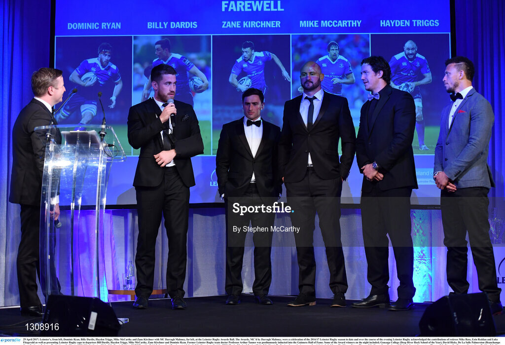 29 April 2017; Leinster's, from left, Dominic Ryan, Billy Dardis, Hayden Triggs, Mike McCarthy and Zane Kirchner with MC Darragh Maloney, far left, at the Leinster Rugby Awards Ball. The Awards, MC’d by Darragh Maloney, were a celebration of the 2016/17 Leinster Rugby season to date and over the course of the evening Leinster Rugby acknowledged the contributions of retirees Mike Ross, Eóin Reddan and Luke Fitzgerald as well as presenting Leinster Rugby caps to departees Bill Dardis, Hayden Triggs, Mike McCarthy, Zane Kirchner and Dominic Ryan. Former Leinster Rugby team doctor Professor Arthur Tanner was posthumously inducted into the Guinness Hall of Fame. Some of the Award winners on the night included; Gonzaga College (Deep River Rock School of the Year), David Hicks, De La Salle Palmerston (Beauchamps Contribution to Leinster Rugby Award), Clontarf FC (CityJet Senior Club of the Year), Coláiste Chill Mhantáin (Irish Independent Development School of the Year Award), Athy RFC (Bank of Ireland Junior Club of the Year). Professional award winners on the night included Laya Healthcare Young Player of the Year - Joey Carbery, Life Style Sports Supporters Player of the Year - Isa Nacewa, Canterbury Tackle of the Year – Isa Nacewa, Irish Independnet Try of the Year – Adam Byrne and Bank of Ireland Players’ Player of the Year – Luke McGrath. Clayton Hotel, Burlington Road, Dublin 4. Photo by Stephen McCarthy/Sportsfile