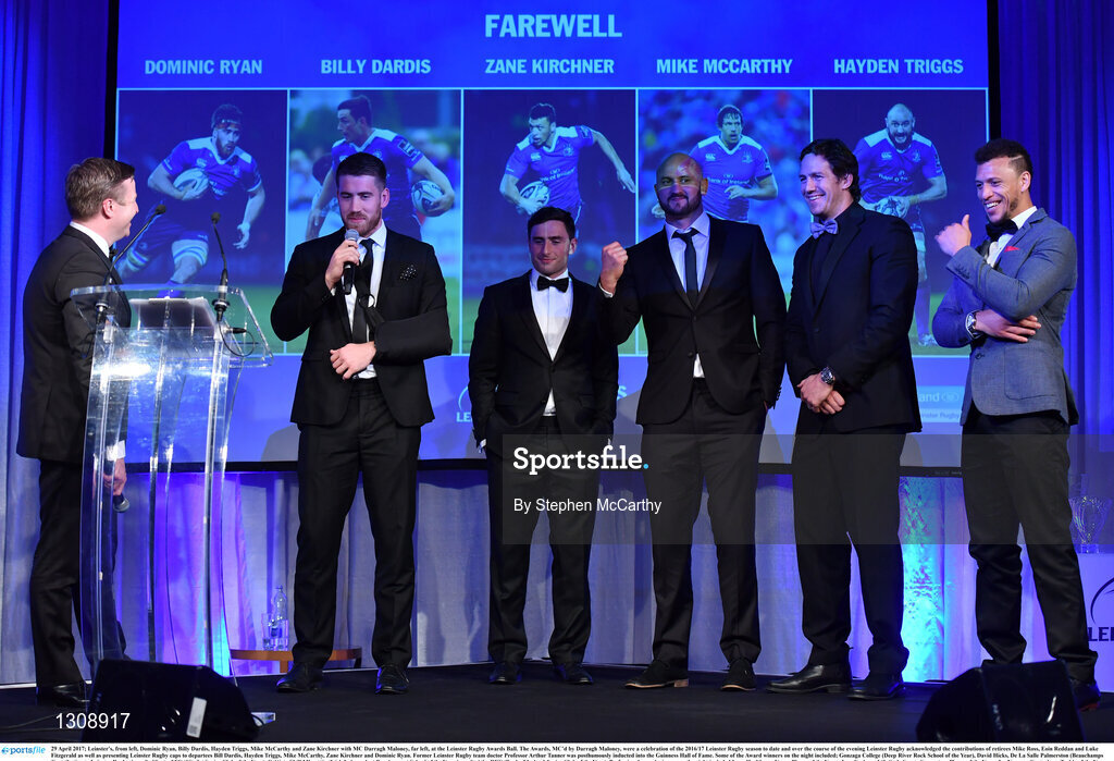 29 April 2017; Leinster's, from left, Dominic Ryan, Billy Dardis, Hayden Triggs, Mike McCarthy and Zane Kirchner with MC Darragh Maloney, far left, at the Leinster Rugby Awards Ball. The Awards, MC’d by Darragh Maloney, were a celebration of the 2016/17 Leinster Rugby season to date and over the course of the evening Leinster Rugby acknowledged the contributions of retirees Mike Ross, Eóin Reddan and Luke Fitzgerald as well as presenting Leinster Rugby caps to departees Bill Dardis, Hayden Triggs, Mike McCarthy, Zane Kirchner and Dominic Ryan. Former Leinster Rugby team doctor Professor Arthur Tanner was posthumously inducted into the Guinness Hall of Fame. Some of the Award winners on the night included; Gonzaga College (Deep River Rock School of the Year), David Hicks, De La Salle Palmerston (Beauchamps Contribution to Leinster Rugby Award), Clontarf FC (CityJet Senior Club of the Year), Coláiste Chill Mhantáin (Irish Independent Development School of the Year Award), Athy RFC (Bank of Ireland Junior Club of the Year). Professional award winners on the night included Laya Healthcare Young Player of the Year - Joey Carbery, Life Style Sports Supporters Player of the Year - Isa Nacewa, Canterbury Tackle of the Year – Isa Nacewa, Irish Independnet Try of the Year – Adam Byrne and Bank of Ireland Players’ Player of the Year – Luke McGrath. Clayton Hotel, Burlington Road, Dublin 4. Photo by Stephen McCarthy/Sportsfile