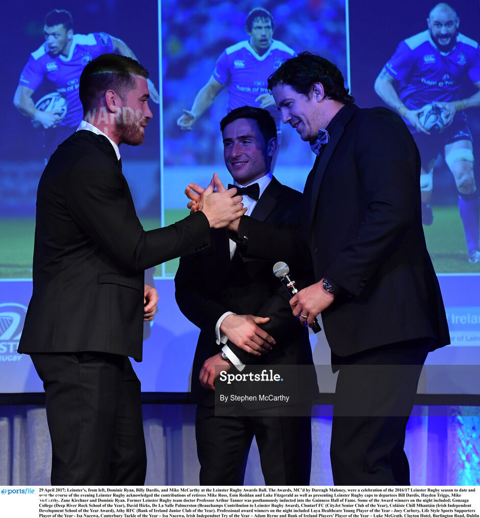 29 April 2017; Leinster's, from left, Dominic Ryan, Billy Dardis, and Mike McCarthy at the Leinster Rugby Awards Ball. The Awards, MC’d by Darragh Maloney, were a celebration of the 2016/17 Leinster Rugby season to date and over the course of the evening Leinster Rugby acknowledged the contributions of retirees Mike Ross, Eóin Reddan and Luke Fitzgerald as well as presenting Leinster Rugby caps to departees Bill Dardis, Hayden Triggs, Mike McCarthy, Zane Kirchner and Dominic Ryan. Former Leinster Rugby team doctor Professor Arthur Tanner was posthumously inducted into the Guinness Hall of Fame. Some of the Award winners on the night included; Gonzaga College (Deep River Rock School of the Year), David Hicks, De La Salle Palmerston (Beauchamps Contribution to Leinster Rugby Award), Clontarf FC (CityJet Senior Club of the Year), Coláiste Chill Mhantáin (Irish Independent Development School of the Year Award), Athy RFC (Bank of Ireland Junior Club of the Year). Professional award winners on the night included Laya Healthcare Young Player of the Year - Joey Carbery, Life Style Sports Supporters Player of the Year - Isa Nacewa, Canterbury Tackle of the Year – Isa Nacewa, Irish Independnet Try of the Year – Adam Byrne and Bank of Ireland Players’ Player of the Year – Luke McGrath. Clayton Hotel, Burlington Road, Dublin 4. Photo by Stephen McCarthy/Sportsfile