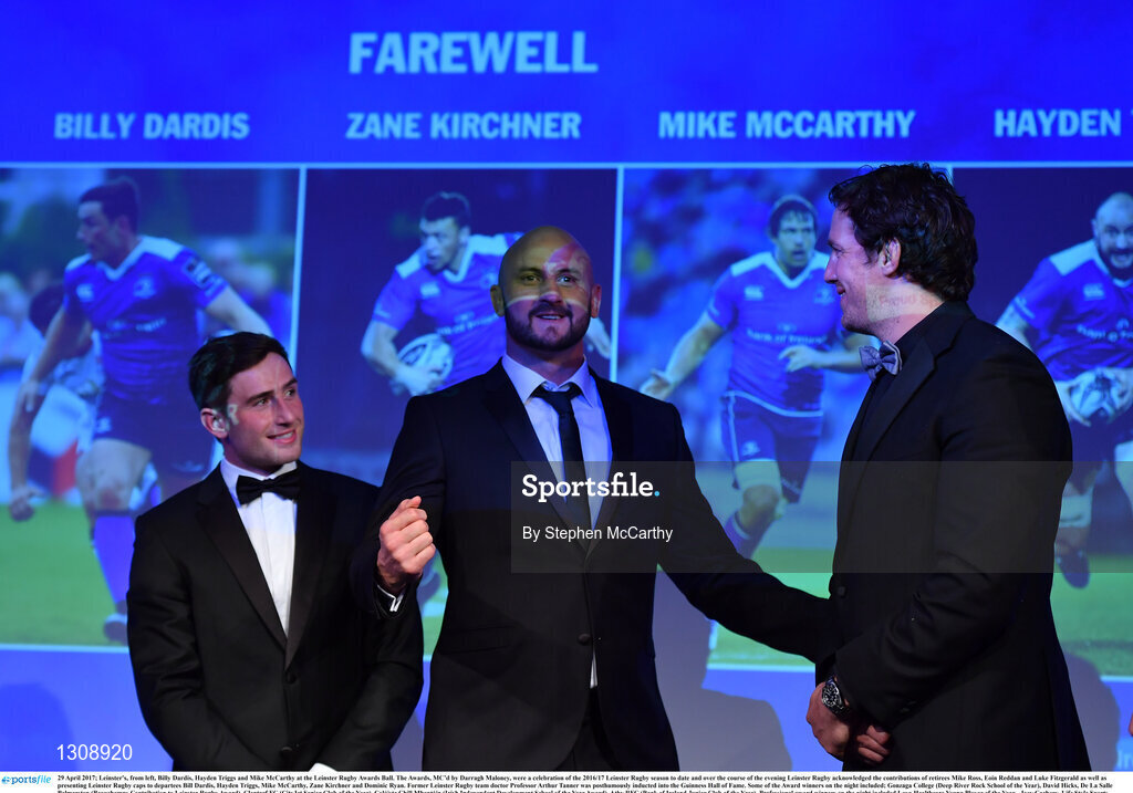 29 April 2017; Leinster's, from left, Billy Dardis, Hayden Triggs and Mike McCarthy at the Leinster Rugby Awards Ball. The Awards, MC’d by Darragh Maloney, were a celebration of the 2016/17 Leinster Rugby season to date and over the course of the evening Leinster Rugby acknowledged the contributions of retirees Mike Ross, Eóin Reddan and Luke Fitzgerald as well as presenting Leinster Rugby caps to departees Bill Dardis, Hayden Triggs, Mike McCarthy, Zane Kirchner and Dominic Ryan. Former Leinster Rugby team doctor Professor Arthur Tanner was posthumously inducted into the Guinness Hall of Fame. Some of the Award winners on the night included; Gonzaga College (Deep River Rock School of the Year), David Hicks, De La Salle Palmerston (Beauchamps Contribution to Leinster Rugby Award), Clontarf FC (CityJet Senior Club of the Year), Coláiste Chill Mhantáin (Irish Independent Development School of the Year Award), Athy RFC (Bank of Ireland Junior Club of the Year). Professional award winners on the night included Laya Healthcare Young Player of the Year - Joey Carbery, Life Style Sports Supporters Player of the Year - Isa Nacewa, Canterbury Tackle of the Year – Isa Nacewa, Irish Independnet Try of the Year – Adam Byrne and Bank of Ireland Players’ Player of the Year – Luke McGrath. Clayton Hotel, Burlington Road, Dublin 4. Photo by Stephen McCarthy/Sportsfile