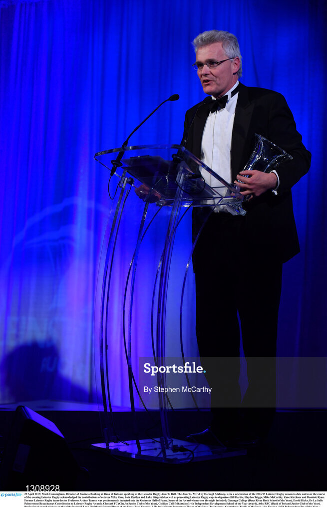 29 April 2017; Mark Cunningham, Director of Business Banking at Bank of Ireland, speaking at the Leinster Rugby Awards Ball. The Awards, MC’d by Darragh Maloney, were a celebration of the 2016/17 Leinster Rugby season to date and over the course of the evening Leinster Rugby acknowledged the contributions of retirees Mike Ross, Eóin Reddan and Luke Fitzgerald as well as presenting Leinster Rugby caps to departees Bill Dardis, Hayden Triggs, Mike McCarthy, Zane Kirchner and Dominic Ryan. Former Leinster Rugby team doctor Professor Arthur Tanner was posthumously inducted into the Guinness Hall of Fame. Some of the Award winners on the night included; Gonzaga College (Deep River Rock School of the Year), David Hicks, De La Salle Palmerston (Beauchamps Contribution to Leinster Rugby Award), Clontarf FC (CityJet Senior Club of the Year), Coláiste Chill Mhantáin (Irish Independent Development School of the Year Award), Athy RFC (Bank of Ireland Junior Club of the Year). Professional award winners on the night included Laya Healthcare Young Player of the Year - Joey Carbery, Life Style Sports Supporters Player of the Year - Isa Nacewa, Canterbury Tackle of the Year – Isa Nacewa, Irish Independnet Try of the Year – Adam Byrne and Bank of Ireland Players’ Player of the Year – Luke McGrath. Clayton Hotel, Burlington Road, Dublin 4. Photo by Stephen McCarthy/Sportsfile