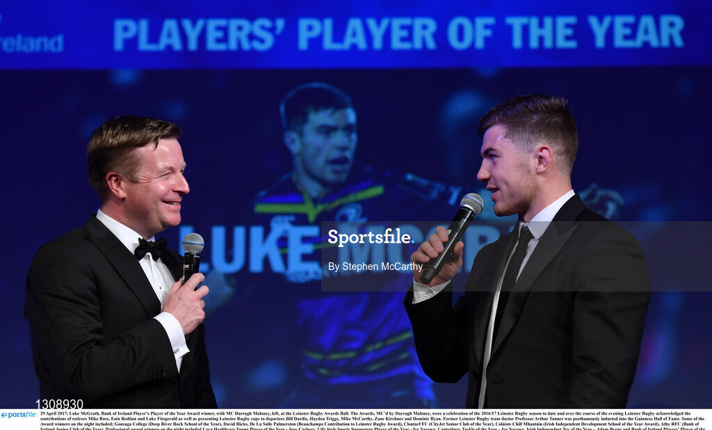 29 April 2017; Luke McGrath, Bank of Ireland Player’s Player of the Year Award winner, with MC Darragh Maloney, left, at the Leinster Rugby Awards Ball. The Awards, MC’d by Darragh Maloney, were a celebration of the 2016/17 Leinster Rugby season to date and over the course of the evening Leinster Rugby acknowledged the contributions of retirees Mike Ross, Eóin Reddan and Luke Fitzgerald as well as presenting Leinster Rugby caps to departees Bill Dardis, Hayden Triggs, Mike McCarthy, Zane Kirchner and Dominic Ryan. Former Leinster Rugby team doctor Professor Arthur Tanner was posthumously inducted into the Guinness Hall of Fame. Some of the Award winners on the night included; Gonzaga College (Deep River Rock School of the Year), David Hicks, De La Salle Palmerston (Beauchamps Contribution to Leinster Rugby Award), Clontarf FC (CityJet Senior Club of the Year), Coláiste Chill Mhantáin (Irish Independent Development School of the Year Award), Athy RFC (Bank of Ireland Junior Club of the Year). Professional award winners on the night included Laya Healthcare Young Player of the Year - Joey Carbery, Life Style Sports Supporters Player of the Year - Isa Nacewa, Canterbury Tackle of the Year – Isa Nacewa, Irish Independnet Try of the Year – Adam Byrne and Bank of Ireland Players’ Player of the Year – Luke McGrath. Clayton Hotel, Burlington Road, Dublin 4. Photo by Stephen McCarthy/Sportsfile