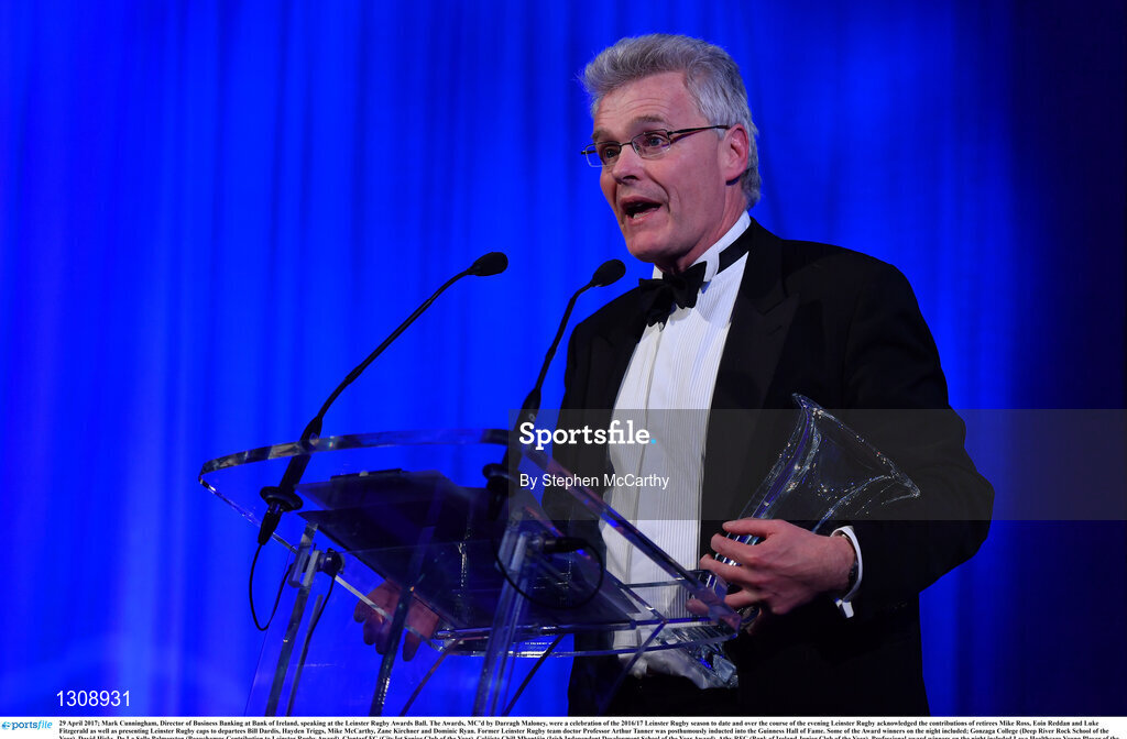 29 April 2017; Mark Cunningham, Director of Business Banking at Bank of Ireland, speaking at the Leinster Rugby Awards Ball. The Awards, MC’d by Darragh Maloney, were a celebration of the 2016/17 Leinster Rugby season to date and over the course of the evening Leinster Rugby acknowledged the contributions of retirees Mike Ross, Eóin Reddan and Luke Fitzgerald as well as presenting Leinster Rugby caps to departees Bill Dardis, Hayden Triggs, Mike McCarthy, Zane Kirchner and Dominic Ryan. Former Leinster Rugby team doctor Professor Arthur Tanner was posthumously inducted into the Guinness Hall of Fame. Some of the Award winners on the night included; Gonzaga College (Deep River Rock School of the Year), David Hicks, De La Salle Palmerston (Beauchamps Contribution to Leinster Rugby Award), Clontarf FC (CityJet Senior Club of the Year), Coláiste Chill Mhantáin (Irish Independent Development School of the Year Award), Athy RFC (Bank of Ireland Junior Club of the Year). Professional award winners on the night included Laya Healthcare Young Player of the Year - Joey Carbery, Life Style Sports Supporters Player of the Year - Isa Nacewa, Canterbury Tackle of the Year – Isa Nacewa, Irish Independnet Try of the Year – Adam Byrne and Bank of Ireland Players’ Player of the Year – Luke McGrath. Clayton Hotel, Burlington Road, Dublin 4. Photo by Stephen McCarthy/Sportsfile