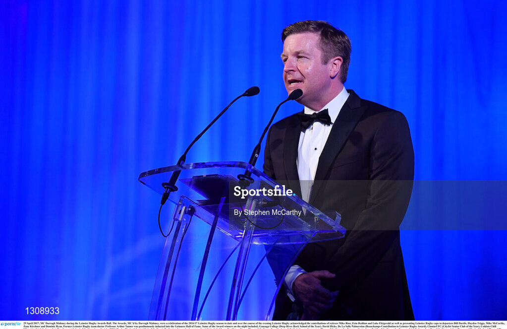 29 April 2017; MC Darragh Maloney during the Leinster Rugby Awards Ball. The Awards, MC’d by Darragh Maloney, were a celebration of the 2016/17 Leinster Rugby season to date and over the course of the evening Leinster Rugby acknowledged the contributions of retirees Mike Ross, Eóin Reddan and Luke Fitzgerald as well as presenting Leinster Rugby caps to departees Bill Dardis, Hayden Triggs, Mike McCarthy, Zane Kirchner and Dominic Ryan. Former Leinster Rugby team doctor Professor Arthur Tanner was posthumously inducted into the Guinness Hall of Fame. Some of the Award winners on the night included; Gonzaga College (Deep River Rock School of the Year), David Hicks, De La Salle Palmerston (Beauchamps Contribution to Leinster Rugby Award), Clontarf FC (CityJet Senior Club of the Year), Coláiste Chill Mhantáin (Irish Independent Development School of the Year Award), Athy RFC (Bank of Ireland Junior Club of the Year). Professional award winners on the night included Laya Healthcare Young Player of the Year - Joey Carbery, Life Style Sports Supporters Player of the Year - Isa Nacewa, Canterbury Tackle of the Year – Isa Nacewa, Irish Independnet Try of the Year – Adam Byrne and Bank of Ireland Players’ Player of the Year – Luke McGrath. Clayton Hotel, Burlington Road, Dublin 4. Photo by Stephen McCarthy/Sportsfile
