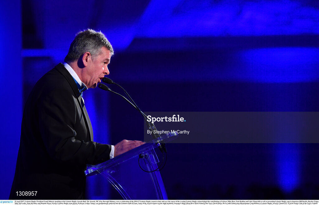 29 April 2017; Leinster Rugby President Frank Doherty speaking at the Leinster Rugby Awards Ball. The Awards, MC’d by Darragh Maloney, were a celebration of the 2016/17 Leinster Rugby season to date and over the course of the evening Leinster Rugby acknowledged the contributions of retirees Mike Ross, Eóin Reddan and Luke Fitzgerald as well as presenting Leinster Rugby caps to departees Bill Dardis, Hayden Triggs, Mike McCarthy, Zane Kirchner and Dominic Ryan. Former Leinster Rugby team doctor Professor Arthur Tanner was posthumously inducted into the Guinness Hall of Fame. Some of the Award winners on the night included; Gonzaga College (Deep River Rock School of the Year), David Hicks, De La Salle Palmerston (Beauchamps Contribution to Leinster Rugby Award), Clontarf FC (CityJet Senior Club of the Year), Coláiste Chill Mhantáin (Irish Independent Development School of the Year Award), Athy RFC (Bank of Ireland Junior Club of the Year). Professional award winners on the night included Laya Healthcare Young Player of the Year - Joey Carbery, Life Style Sports Supporters Player of the Year - Isa Nacewa, Canterbury Tackle of the Year – Isa Nacewa, Irish Independnet Try of the Year – Adam Byrne and Bank of Ireland Players’ Player of the Year – Luke McGrath. Clayton Hotel, Burlington Road, Dublin 4. Photo by Stephen McCarthy/Sportsfile