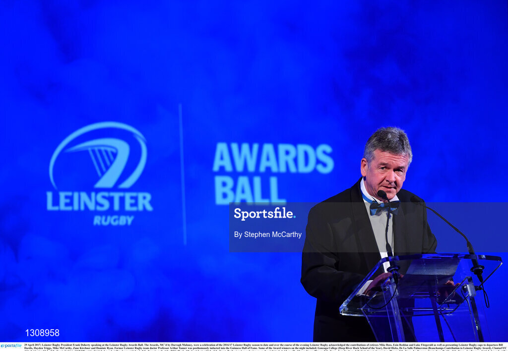 29 April 2017; Leinster Rugby President Frank Doherty speaking at the Leinster Rugby Awards Ball. The Awards, MC’d by Darragh Maloney, were a celebration of the 2016/17 Leinster Rugby season to date and over the course of the evening Leinster Rugby acknowledged the contributions of retirees Mike Ross, Eóin Reddan and Luke Fitzgerald as well as presenting Leinster Rugby caps to departees Bill Dardis, Hayden Triggs, Mike McCarthy, Zane Kirchner and Dominic Ryan. Former Leinster Rugby team doctor Professor Arthur Tanner was posthumously inducted into the Guinness Hall of Fame. Some of the Award winners on the night included; Gonzaga College (Deep River Rock School of the Year), David Hicks, De La Salle Palmerston (Beauchamps Contribution to Leinster Rugby Award), Clontarf FC (CityJet Senior Club of the Year), Coláiste Chill Mhantáin (Irish Independent Development School of the Year Award), Athy RFC (Bank of Ireland Junior Club of the Year). Professional award winners on the night included Laya Healthcare Young Player of the Year - Joey Carbery, Life Style Sports Supporters Player of the Year - Isa Nacewa, Canterbury Tackle of the Year – Isa Nacewa, Irish Independnet Try of the Year – Adam Byrne and Bank of Ireland Players’ Player of the Year – Luke McGrath. Clayton Hotel, Burlington Road, Dublin 4. Photo by Stephen McCarthy/Sportsfile