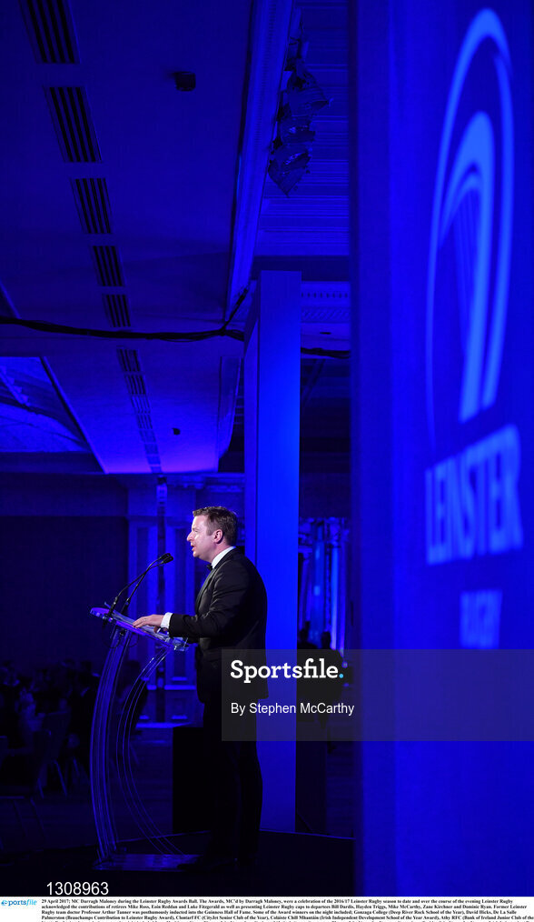29 April 2017; MC Darragh Maloney during the Leinster Rugby Awards Ball. The Awards, MC’d by Darragh Maloney, were a celebration of the 2016/17 Leinster Rugby season to date and over the course of the evening Leinster Rugby acknowledged the contributions of retirees Mike Ross, Eóin Reddan and Luke Fitzgerald as well as presenting Leinster Rugby caps to departees Bill Dardis, Hayden Triggs, Mike McCarthy, Zane Kirchner and Dominic Ryan. Former Leinster Rugby team doctor Professor Arthur Tanner was posthumously inducted into the Guinness Hall of Fame. Some of the Award winners on the night included; Gonzaga College (Deep River Rock School of the Year), David Hicks, De La Salle Palmerston (Beauchamps Contribution to Leinster Rugby Award), Clontarf FC (CityJet Senior Club of the Year), Coláiste Chill Mhantáin (Irish Independent Development School of the Year Award), Athy RFC (Bank of Ireland Junior Club of the Year). Professional award winners on the night included Laya Healthcare Young Player of the Year - Joey Carbery, Life Style Sports Supporters Player of the Year - Isa Nacewa, Canterbury Tackle of the Year – Isa Nacewa, Irish Independnet Try of the Year – Adam Byrne and Bank of Ireland Players’ Player of the Year – Luke McGrath. Clayton Hotel, Burlington Road, Dublin 4. Photo by Stephen McCarthy/Sportsfile