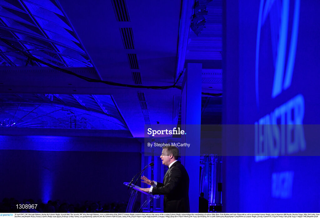 29 April 2017; MC Darragh Maloney during the Leinster Rugby Awards Ball. The Awards, MC’d by Darragh Maloney, were a celebration of the 2016/17 Leinster Rugby season to date and over the course of the evening Leinster Rugby acknowledged the contributions of retirees Mike Ross, Eóin Reddan and Luke Fitzgerald as well as presenting Leinster Rugby caps to departees Bill Dardis, Hayden Triggs, Mike McCarthy, Zane Kirchner and Dominic Ryan. Former Leinster Rugby team doctor Professor Arthur Tanner was posthumously inducted into the Guinness Hall of Fame. Some of the Award winners on the night included; Gonzaga College (Deep River Rock School of the Year), David Hicks, De La Salle Palmerston (Beauchamps Contribution to Leinster Rugby Award), Clontarf FC (CityJet Senior Club of the Year), Coláiste Chill Mhantáin (Irish Independent Development School of the Year Award), Athy RFC (Bank of Ireland Junior Club of the Year). Professional award winners on the night included Laya Healthcare Young Player of the Year - Joey Carbery, Life Style Sports Supporters Player of the Year - Isa Nacewa, Canterbury Tackle of the Year – Isa Nacewa, Irish Independnet Try of the Year – Adam Byrne and Bank of Ireland Players’ Player of the Year – Luke McGrath. Clayton Hotel, Burlington Road, Dublin 4. Photo by Stephen McCarthy/Sportsfile