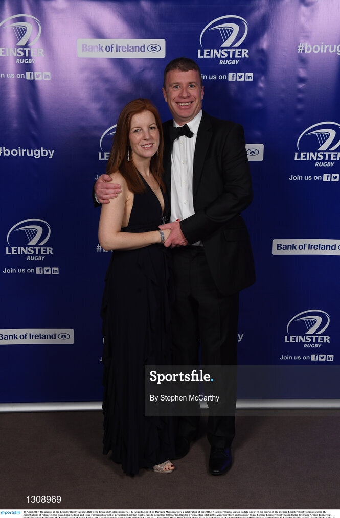 29 April 2017; On arrival at the Leinster Rugby Awards Ball were Trina and Colm Saunders. The Awards, MC’d by Darragh Maloney, were a celebration of the 2016/17 Leinster Rugby season to date and over the course of the evening Leinster Rugby acknowledged the contributions of retirees Mike Ross, Eóin Reddan and Luke Fitzgerald as well as presenting Leinster Rugby caps to departees Bill Dardis, Hayden Triggs, Mike McCarthy, Zane Kirchner and Dominic Ryan. Former Leinster Rugby team doctor Professor Arthur Tanner was posthumously inducted into the Guinness Hall of Fame. Some of the Award winners on the night included; Gonzaga College (Deep River Rock School of the Year), David Hicks, De La Salle Palmerston (Beauchamps Contribution to Leinster Rugby Award), Clontarf FC (CityJet Senior Club of the Year), Coláiste Chill Mhantáin (Irish Independent Development School of the Year Award), Athy RFC (Bank of Ireland Junior Club of the Year). Clayton Hotel, Burlington Road, Dublin 4. Photo by Stephen McCarthy/Sportsfile