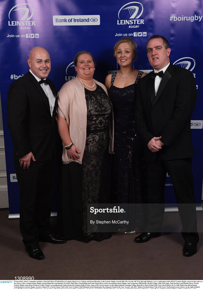 29 April 2017; OLSC Committee members, from left, Berty O'Neill, Rebecca Leggett, Sharon Levy Valensi, and Jarrod Bromley at the Leinster Rugby Awards Ball. The Awards, MC’d by Darragh Maloney, were a celebration of the 2016/17 Leinster Rugby season to date and over the course of the evening Leinster Rugby acknowledged the contributions of retirees Mike Ross, Eóin Reddan and Luke Fitzgerald as well as presenting Leinster Rugby caps to departees Bill Dardis, Hayden Triggs, Mike McCarthy, Zane Kirchner and Dominic Ryan. Former Leinster Rugby team doctor Professor Arthur Tanner was posthumously inducted into the Guinness Hall of Fame. Some of the Award winners on the night included; Gonzaga College (Deep River Rock School of the Year), David Hicks, De La Salle Palmerston (Beauchamps Contribution to Leinster Rugby Award), Clontarf FC (CityJet Senior Club of the Year), Coláiste Chill Mhantáin (Irish Independent Development School of the Year Award), Athy RFC (Bank of Ireland Junior Club of the Year). Professional award winners on the night included Laya Healthcare Young Player of the Year - Joey Carbery, Life Style Sports Supporters Player of the Year - Isa Nacewa, Canterbury Tackle of the Year – Isa Nacewa, Irish Independnet Try of the Year – Adam Byrne and Bank of Ireland Players’ Player of the Year – Luke McGrath. Clayton Hotel, Burlington Road, Dublin 4. Photo by Stephen McCarthy/Sportsfile