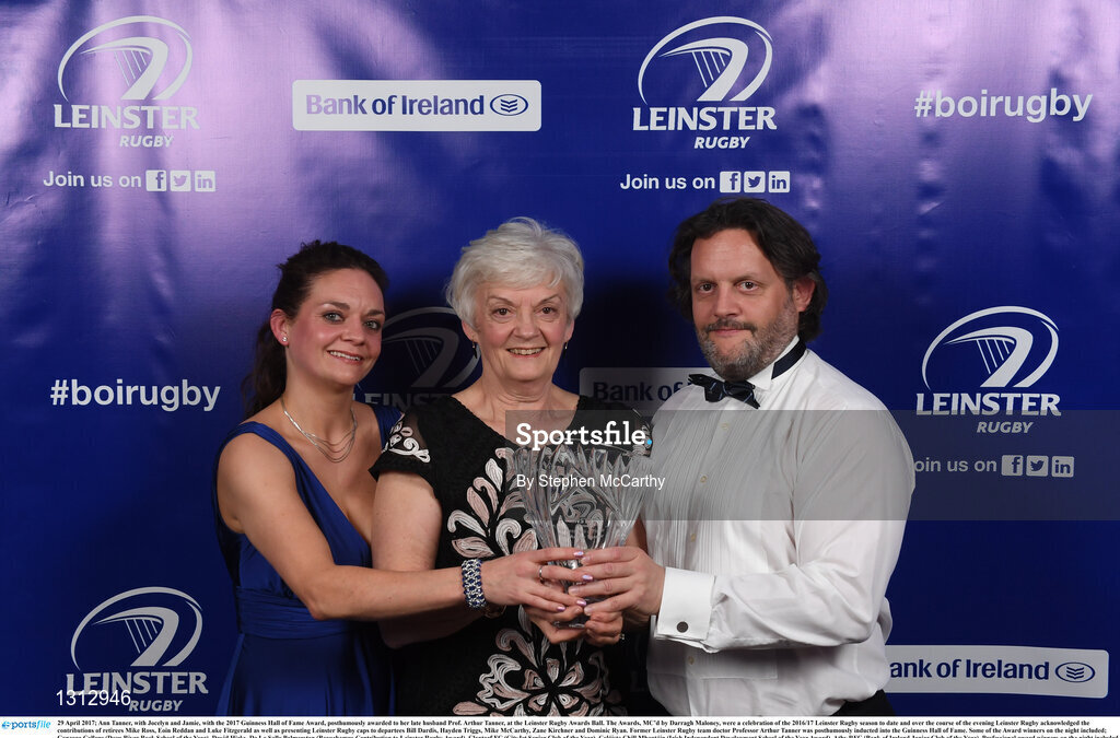 29 April 2017; Ann Tanner, with Jocelyn and Jamie, with the 2017 Guinness Hall of Fame Award, posthumously awarded to her late husband Prof. Arthur Tanner, at the Leinster Rugby Awards Ball. The Awards, MC’d by Darragh Maloney, were a celebration of the 2016/17 Leinster Rugby season to date and over the course of the evening Leinster Rugby acknowledged the contributions of retirees Mike Ross, Eóin Reddan and Luke Fitzgerald as well as presenting Leinster Rugby caps to departees Bill Dardis, Hayden Triggs, Mike McCarthy, Zane Kirchner and Dominic Ryan. Former Leinster Rugby team doctor Professor Arthur Tanner was posthumously inducted into the Guinness Hall of Fame. Some of the Award winners on the night included; Gonzaga College (Deep River Rock School of the Year), David Hicks, De La Salle Palmerston (Beauchamps Contribution to Leinster Rugby Award), Clontarf FC (CityJet Senior Club of the Year), Coláiste Chill Mhantáin (Irish Independent Development School of the Year Award), Athy RFC (Bank of Ireland Junior Club of the Year). Professional award winners on the night included Laya Healthcare Young Player of the Year - Joey Carbery, Life Style Sports Supporters Player of the Year - Isa Nacewa, Canterbury Tackle of the Year – Isa Nacewa, Irish Independnet Try of the Year – Adam Byrne and Bank of Ireland Players’ Player of the Year – Luke McGrath. Clayton Hotel, Burlington Road, Dublin 4. Photo by Stephen McCarthy/Sportsfile